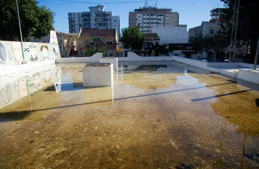 A parte superior do reservatório de água da Corsan na Praça Saturnino de Brito, que abastece a área central de Santa Maria, virou um piscinão, com água empoçada por dias, além de lixo e um colchão. Questionada, a companhia não sabia do problema.