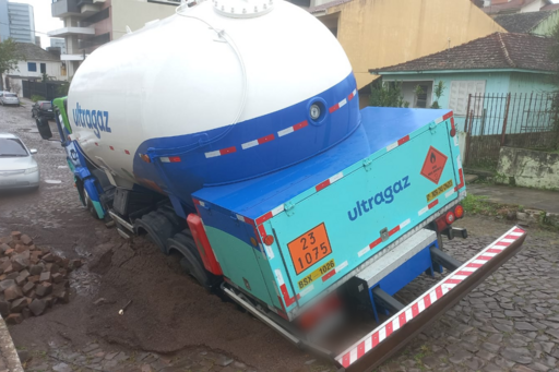 Um caminhão de gás caiu em um buraco na Rua 12 de Outubro, próximo da Avenida Medianeira, no Bairro Nossa Senhora de Lourdes, na tarde desta segunda-feira (24).