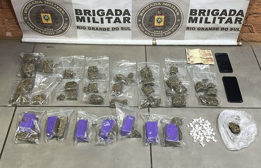 Durante a abordagem, os policiais encontraram e apreenderam 53 porções de cocaína, 23 porções de maconha, sete tijolos de maconha, dois celulares, uma bolsa e R$ 100.