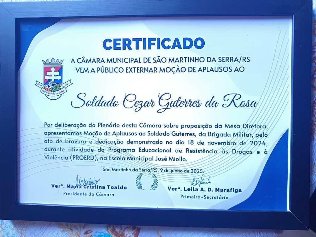 O soldado da Brigada Militar Cezar Guterres da Rosa, 34 anos, foi homenageado, na última segunda-feira (9), pela Câmara dos Vereadores de São Martinho da Serra, por um ato de bravura realizado por ele  na Escola Municipal José Miollo, que fica na localidade de Campinas. No ano passado, o PM ministrava uma aula do Programa Educacional de Resistência às Drogas e à Violência (Proerd) para os alunos do 5º ano quando um curto-circuito teve início. Foi necessário agir de forma rápida para, sozinho, conter as chamas e salvar as crianças.