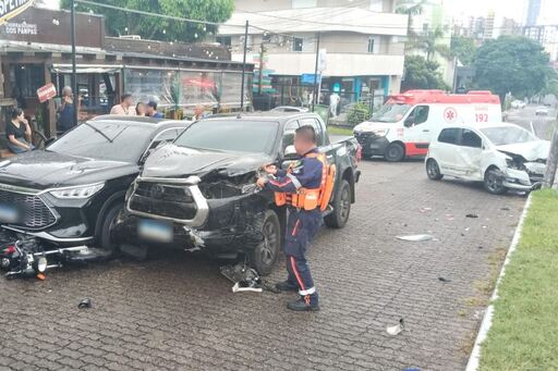 Uma colisão entre quatro veículos, registrada por volta das 15h desta terça-feira, provocou congestioamento na Avenida Fernando Ferrari, esquina com a Rua Guilherme João Fabrin, no sentido Centro-bairro, em Santa Maria. O acidente envolveu uma caminhonete Toyota Hilux, um Volkswagen Fox, um veículo elétrico BYD Haval e uma motocicleta Yamaha.
