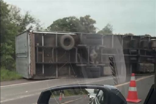 Conforme informações iniciais, o veículo tombou sobre a pista e passou a ocupar parte da rodovia. Por conta disso, o trecho foi sinalizado com cones e o fluxo de veículos ocorre em meia pista.