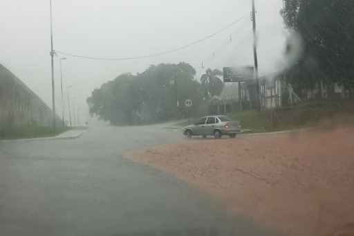 Outro registro foi feito na Estrada Pedro Parcianello, perto da Duque de Caxias com a BR-287. É possível perceber um grande acúmulo de água da chuva no local.