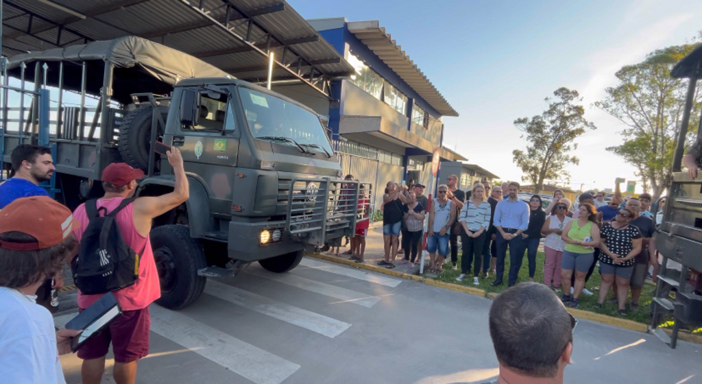 No momento em que os veículos saíam, um a um, do Aeroporto Internacional de Pelotas, uma salva de palmas, puxada pelo governador Eduardo Leite (PSDB) e a prefeita Paula Mascarenhas (PSDB), foi realizada.