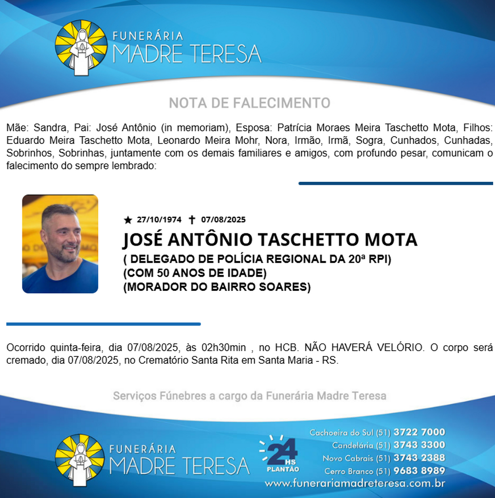 Faleceu, na madrugada desta quinta-feira (7), o delegado da Polícia Civil José Antônio Taschetto Mota, aos 50 anos. Ele estava internado no Hospital de Caridade e Beneficência (HCB), em Cachoeira do Sul, e vinha enfrentando complicações cardíacas. O delegado regional havia sofrido um Acidente Vascular Cerebral (AVC), o que já exigia cuidados médicos.