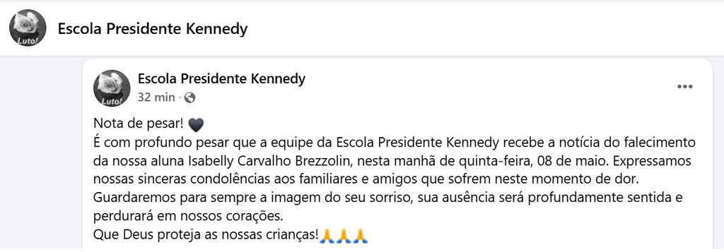 A equipe da escola expressou suas sinceras condolências aos familiares e amigos da estudante, destacando o impacto da perda para todos que conviviam com Isabelly no ambiente escolar.