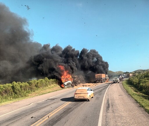 Um grave acidente de trânsito envolvendo duas carretas com placas de Canguçu e Três Passos resultou na morte de duas pessoas por volta das 7h30min desta terça-feira (23) na BR-392, próximo ao trevo de acesso ao município de Santana da Boa Vista. As vítimas são os motoristas dos veículos envolvidos na colisão que ainda não foram identificados. De acordo com a ocorrência, Os veículos envolvidos foram as combinações tracionadas pelos caminhões-tratores Scania/G 380, emplacado em Canguçu, e o Volvo/FH 440, com placas de Três Passos. A Scania se deslocava no sentido Canguçu - Caçapava do Sul, já o Volvo transitava em sentido contrário quando houve o impacto. Com colisão, ambos os veículos pegaram fogo, e parte da carga ficou espalhada sobre a rodovia.