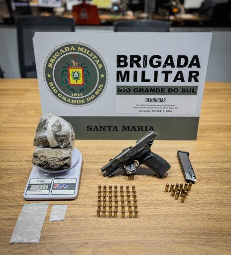 Durante a revista, os policias encontraram uma pistola calibre 9 mm municiada, 42 munições calibre 380, porções de cocaína, uma balança de precisão e dois tabletes de maconha, totalizando 728 gramas.