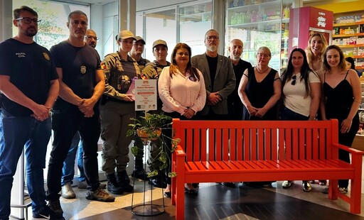 Instalado em espaços públicos ou de grande circulação, o banco traz mensagens de reflexão e informações sobre canais de denúncia e serviços de apoio às vítimas.