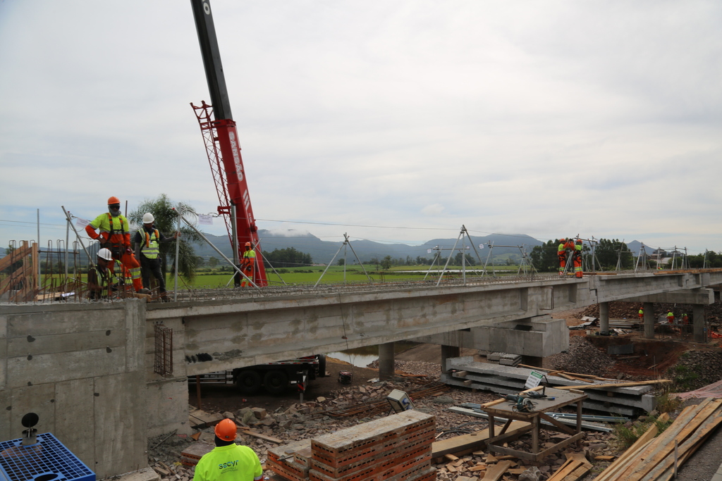 A reconstrução da ponte sobre o Arroio Grande, no quilômetro 226 da RSC-287, em Santa Maria, entrou na fase final da primeira etapa após o içamento das últimas vigas, no início desta semana. A concessionária Rota de Santa Maria projeta a liberação da primeira estrutura definitiva e dos 800 metros de pista duplicada para a metade de março. No entanto, a empresa informou que o cronograma pode sofrer alterações devido ao atraso no repasse de verbas por parte do governo do Estado.