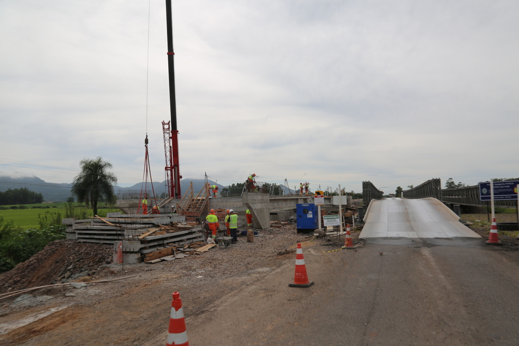 Com a conclusão da colocação das vigas, as equipes trabalham agora na base da estrutura e na finalização das cabeceiras. Após a liberação do tráfego para a nova ponte de concreto em março, as pontes metálicas provisórias instaladas pelo Exército Brasileiro serão retiradas, permitindo o início da construção da segunda ponte, ao lado.