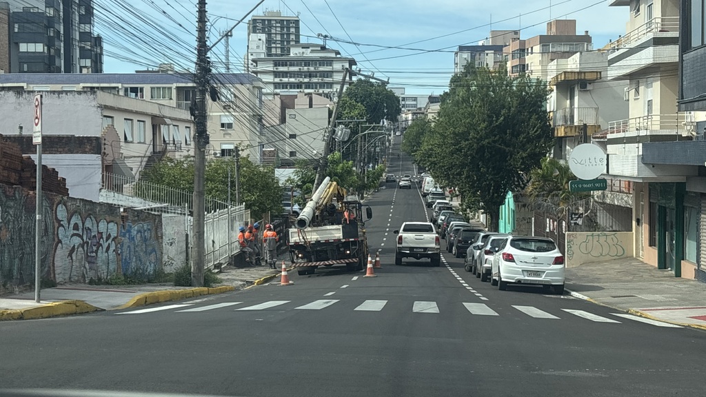 Uma equipe da RGE realiza, na manhã desta segunda-feira (16), reparos em um poste localizado na Rua Duque de Caxias, entre as ruas Olavo Bilac e Tuiuti, em Santa Maria. Com um transformador instalado, ele estava torto e sustentado apenas pela fiação elétrica, situação que indicava risco caso cedesse.