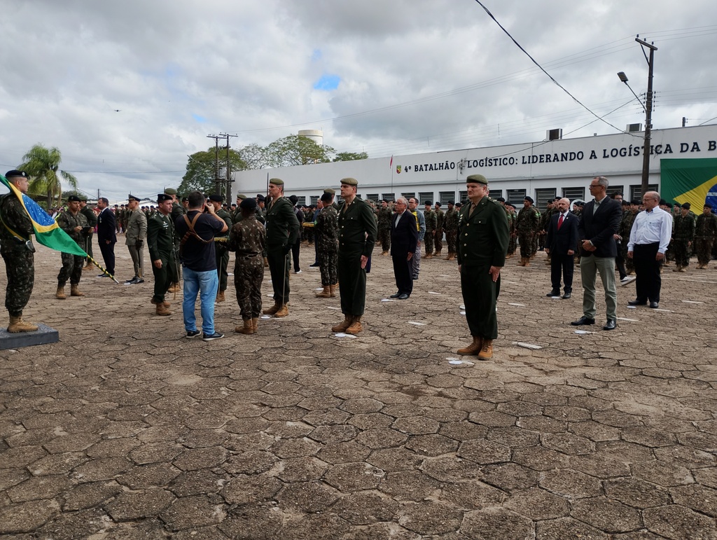 Uma solenidade militar realizada no pátio de formaturas do 4º Batalhão Logístico (4º BLog), na manhã desta quinta-feira (16), marcou o início das comemorações do Dia do Exército em Santa Maria. O evento contou com a participação de 630 militares em forma, além de autoridades civis e militares, veteranos da reserva e convidados. A cerimônia foi presidida pelo comandante da 3ª Divisão de Exército, general Marcus Alexandre Fernandes de Araújo.