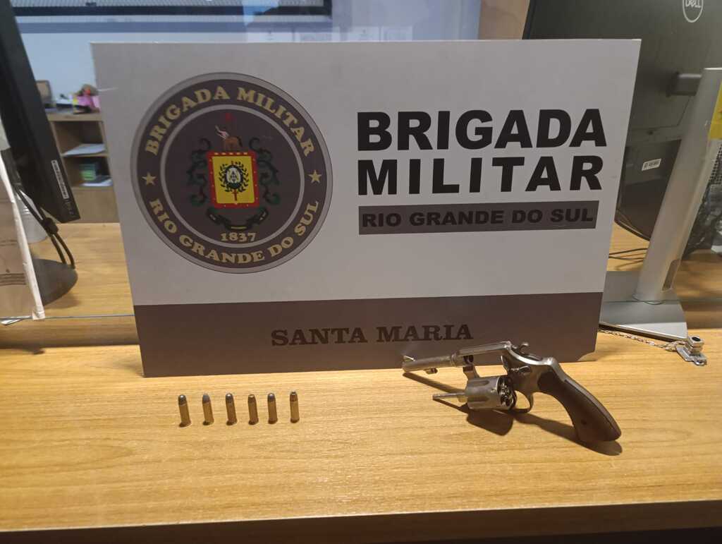 Com o suspeito, que era procurado por envolvimento em uma ocorrência de violência doméstica registrada momentos antes da abordagem, os policiais encontraram e apreenderam um revólver calibre 22 e nove munições.