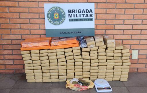 Pela manhã, o efetivo da Ronda Ostensiva com apoio de motocicletas (Rocam) do 1º RPMon localizou na Rua Pedro Ritzel, 158 tabletes de maconha, totalizando 109 kg, além de um notebook e uma balança de precisão.