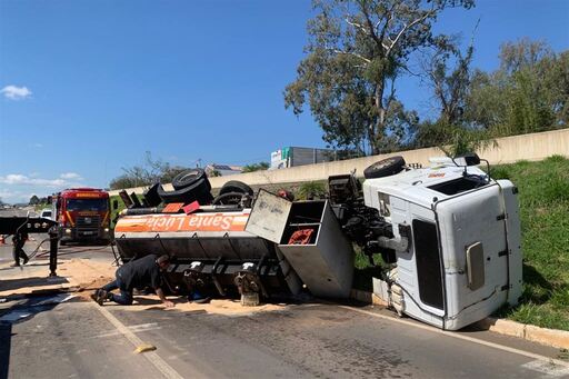 Um caminhão tanque, carregado com óleo diesel, tombou por volta do meio-dia desta segunda-feira (21) na ERS-509, Km 1. De acordo com informações obtidas com o Comando Rodoviário da Brigada Militar (CRBM), o motorista tentou desviar de um veículo na pista, perdeu o controle, subiu no barranco que tem na lateral da via e tombou. O motorista não se feriu.