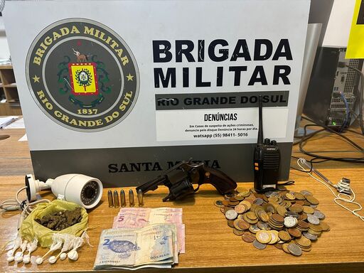 Os policiais decidiram então realizar a abordagem. Durante a revista, foi encontrado um revólver calibre 38, municiado com cinco munições, na cintura do suspeito. Além disso, uma sacola que ele carregava continha uma porção de maconha, sete buchas de cocaína, uma câmera de vigilância, um rádio HT e uma quantia em dinheiro.