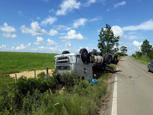 No início da tarde desta sexta-feira (19), um caminhão que transportava arroz tombou na ERS-149, próximo ao Balneário das Tunas, em Restinga Sêca.