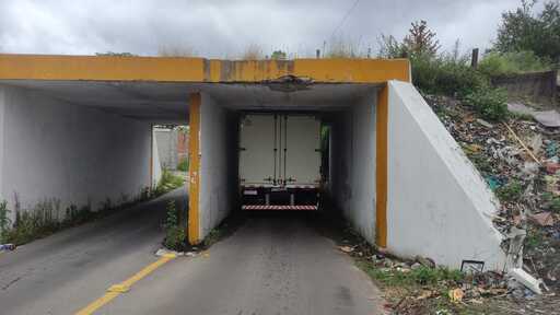 Um caminhão ficou entalado ao tentar passar pelo túnel  no encontro das ruas Manoel Ribas e Valdemar Rodrigues, no Bairro Carolina, na tarde desta quinta-feira (11), em Santa Maria.